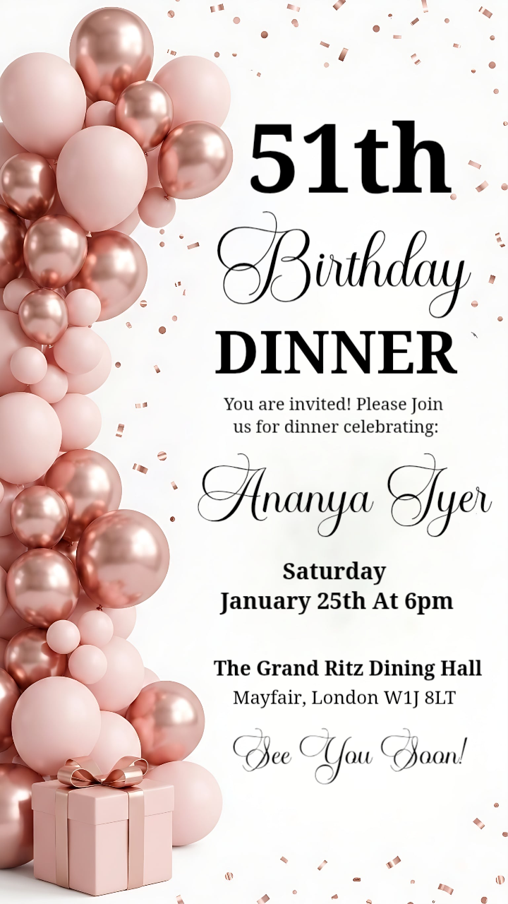 Rose Gold Balloon Birthday Dinner Invitation
