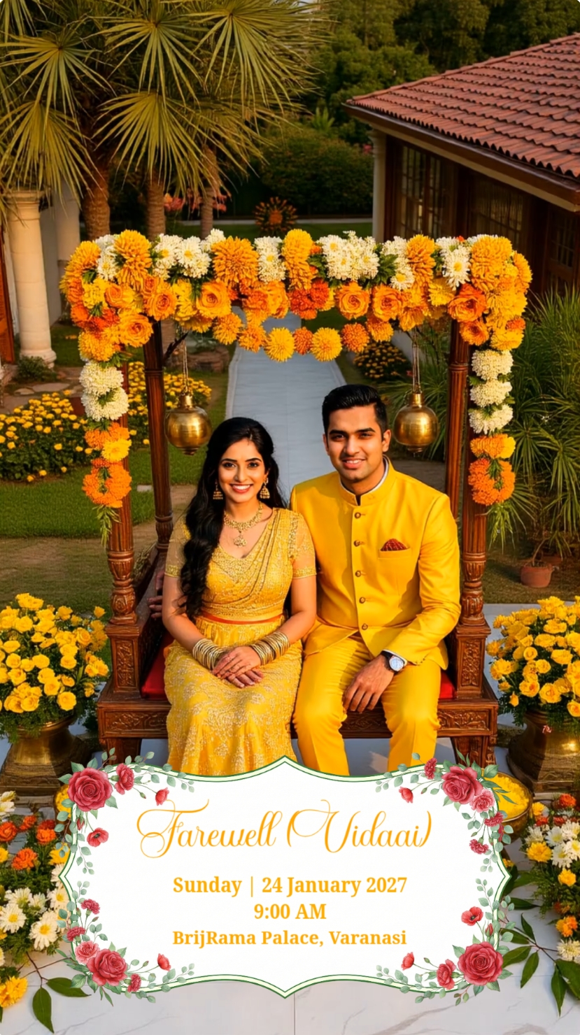 Create stunning wedding invitations with AI-generated images and elegant text overlays for all your wedding events.