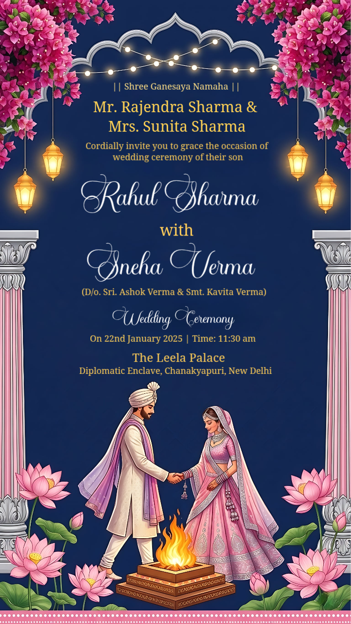 Navy Blue Lotus Phere Wedding Invitation Static Template