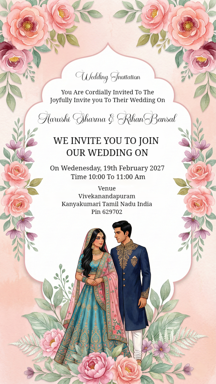 Romantic Pink Floral Indian Wedding Invitation with Couple